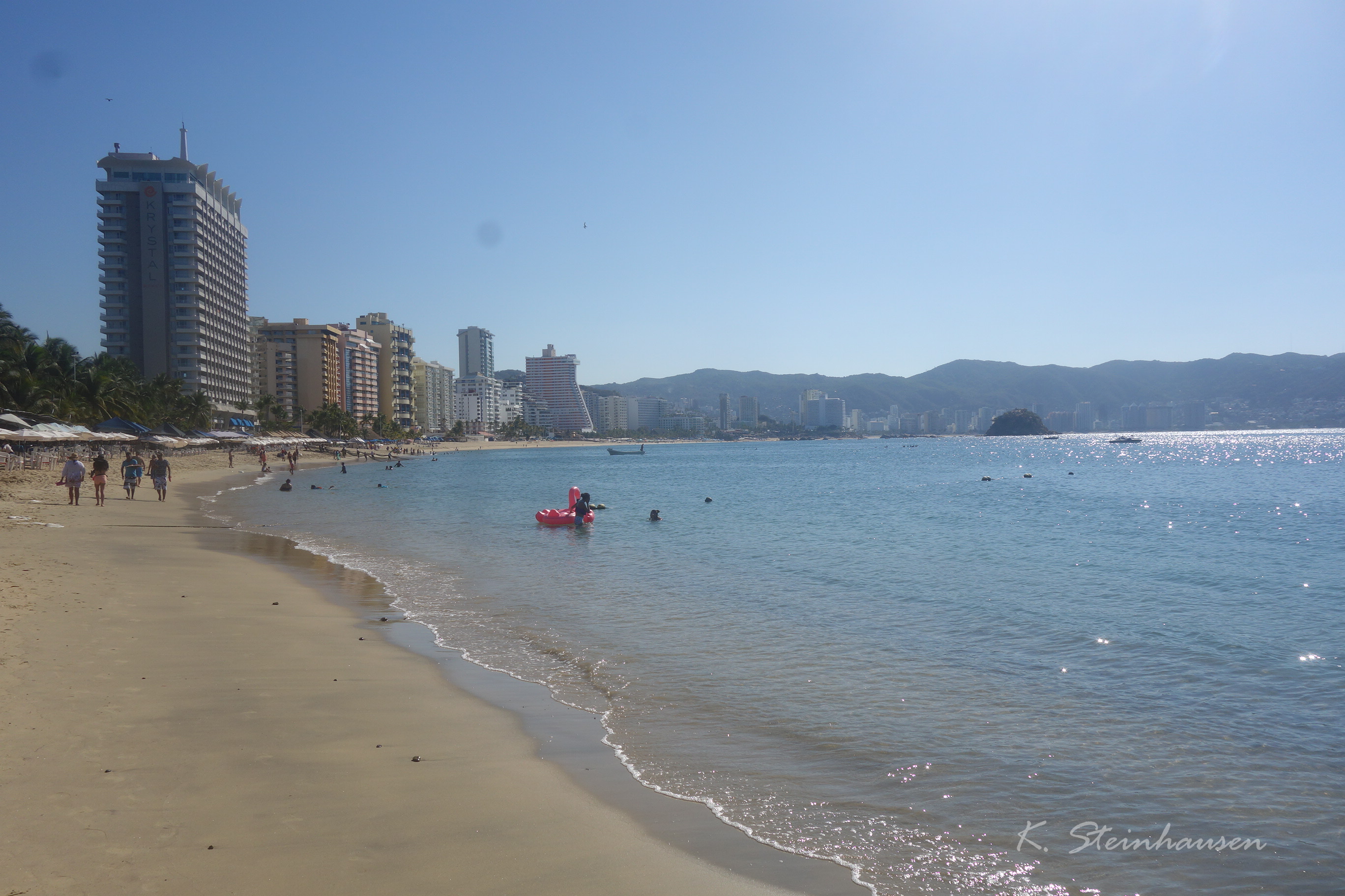 Den Flair mal beiseite lassend, hat Acapulco einen ganz süßen Park, ein Stadtzentrum mit schöneren und weniger schönen Ecken, einen wirklich schönen und gewundenen langen Sandstrand, wo man tolle Fotos machen kann, chillen und mit Sicherheit auch noch ein paar weitere Aktivitäten und sich eine Cliffjumping Show angucken kann. Und das wars dann eigentlich auch schon wieder. Acapulco eignet sich also eher für einen Tagestrip. Ich habe zwar gehört, dass man in Acapulco gut feiern gehen können soll, da ich aber auf Nachfrage erfahren habe, dass da weniger Lateinamerikanische Musik, sondern eher Techno/House/Electro und so aufgelegt werden soll – gaaaar nicht meins – habe ich verzichtet. 😀