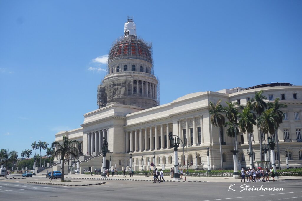 Das Kapitol – el Capitolio – ist das bekannteste Gebäude Havannas und groß, mächtig und ganz in weiß mit Ornamenten und einem Löwenkopf als Türklopfer aus Gold gehalten und ist ein wirklich tolles Gebäude um davor zu posen oder es auch einfach nur kurz zu bewundern. Ich weiß nicht, ob man rein kann, weil ich persönlich keinen Eingang gefunden habe. Dafür, dass man nicht rein kann, waren da aber sehr viele Menschen. Von daher tippe ich auf Tour.