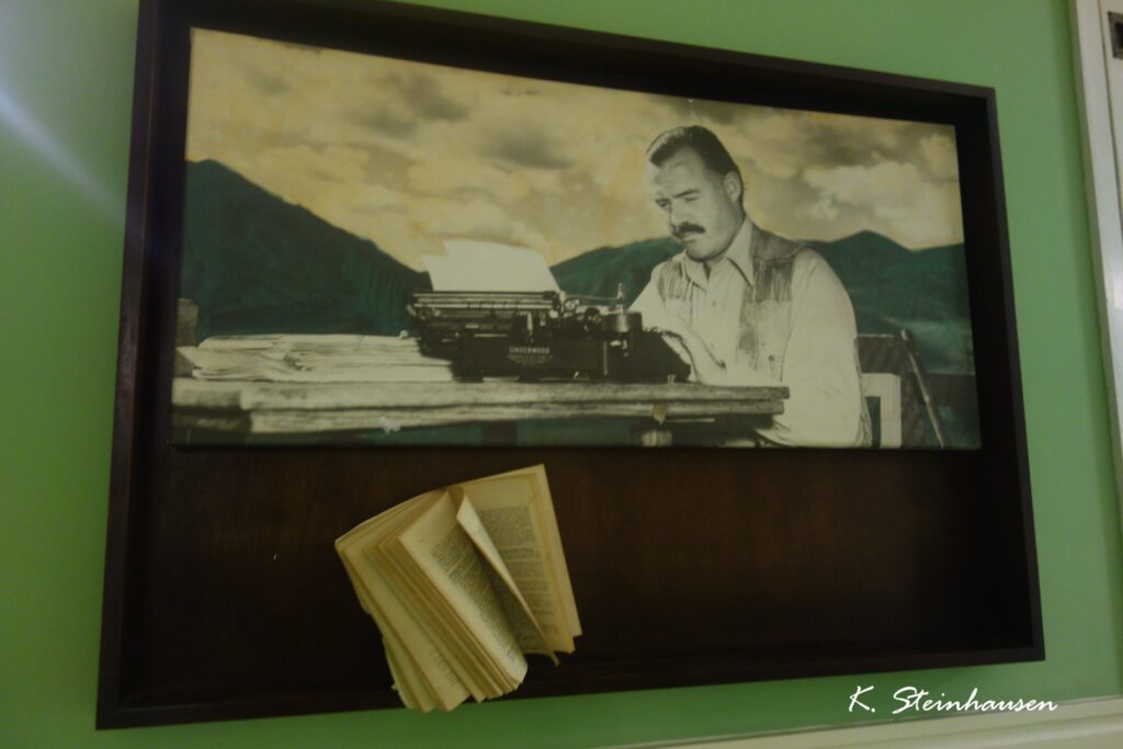 Das Hotel ist nach wie vor buch- und bewohnbar und oben auf dem Dach hat man eine nette Aussicht über die Dächer Havannas. Um das Zimmer zu finden, muss man im Grunde nur den Schildern folgen und steht schon bald an einem kleinen Messingbildnis von Ernest Hemingway wie auch einer großen Fotografie von ihm am Schreibtisch und seiner ehemaligen Schreibmaschine, die in echt an der Wand hängt.
