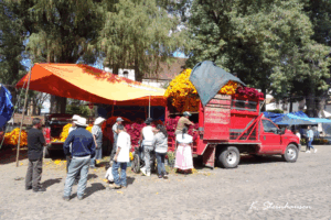 The cemetery in Janitzio is truly beautifully! decorated. It is full of orange flowers, altars, decorated graves, baskets full of fruit offered to the dead, and so on and so forth. There is a small church in the cemetery of Janitzio, in front of which a kind of mini-mass takes place, with communal singing and the consecration of the place itself. The graves and tombs are guarded by relatives who sit with their ancestors and celebrate the Día de los Muertos. It is honestly an incredibly beautiful scene and I am incredibly grateful to have been able to witness it.